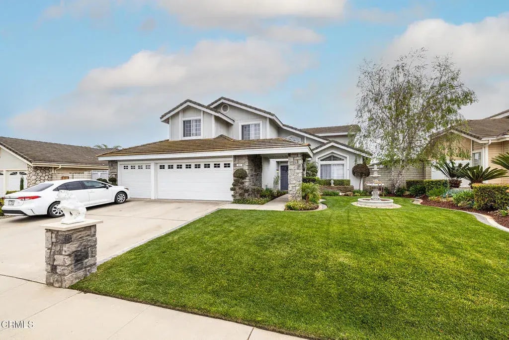 PRICED TO SELL!Welcome to the highly sought-after Camarillo Heights neighborhood, across the street from the newly renovated Eldred Lokker Memorial Park. This spacious 5-bed, 2.5-bath home offers vaulted ceilings, an updated kitchen with granite counters, a farm sink, stainless steel appliances, a mobile island, and deep drawers. The formal living and dining rooms feature travertine and marble flooring with a stunning medallion. The cozy family room includes a dual gas/wood-burning fireplace. Upstairs, the oversized primary suite has dual closets, a private 16.5-ft balcony with panoramic views of mountains, ocean, and fireworks, plus a luxurious bathroom with a walk-in rain shower and toilet closet. Additional features include a Butler's pantry/laundry with a deep cast iron sink, a curved staircase with wrought iron railings, an updated Jack & Jill bath, and travertine floors throughout. The entertainer's backyard boasts multiple seating areas, fountains, Italian Cypress trees, a tranquil pond, a greenhouse, and a 12'x9' concrete shed. Bonus room offers guest quarters or a possible rental. EV hook-up available. This home is move-in ready and situated in a serene yet conveniently located area, and only 7 minutes from the Camarillo Premium Outlet Mall! Schedule your private showing today!